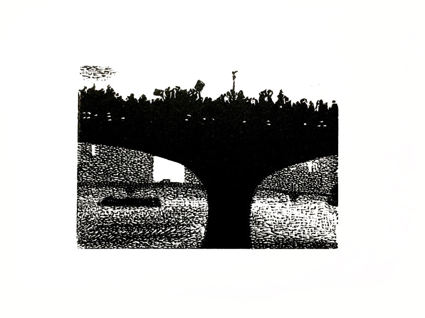 The Protest (XR Westminster Bridge) 2019 wood engraving 5.25 x 7.5 cm edition 40